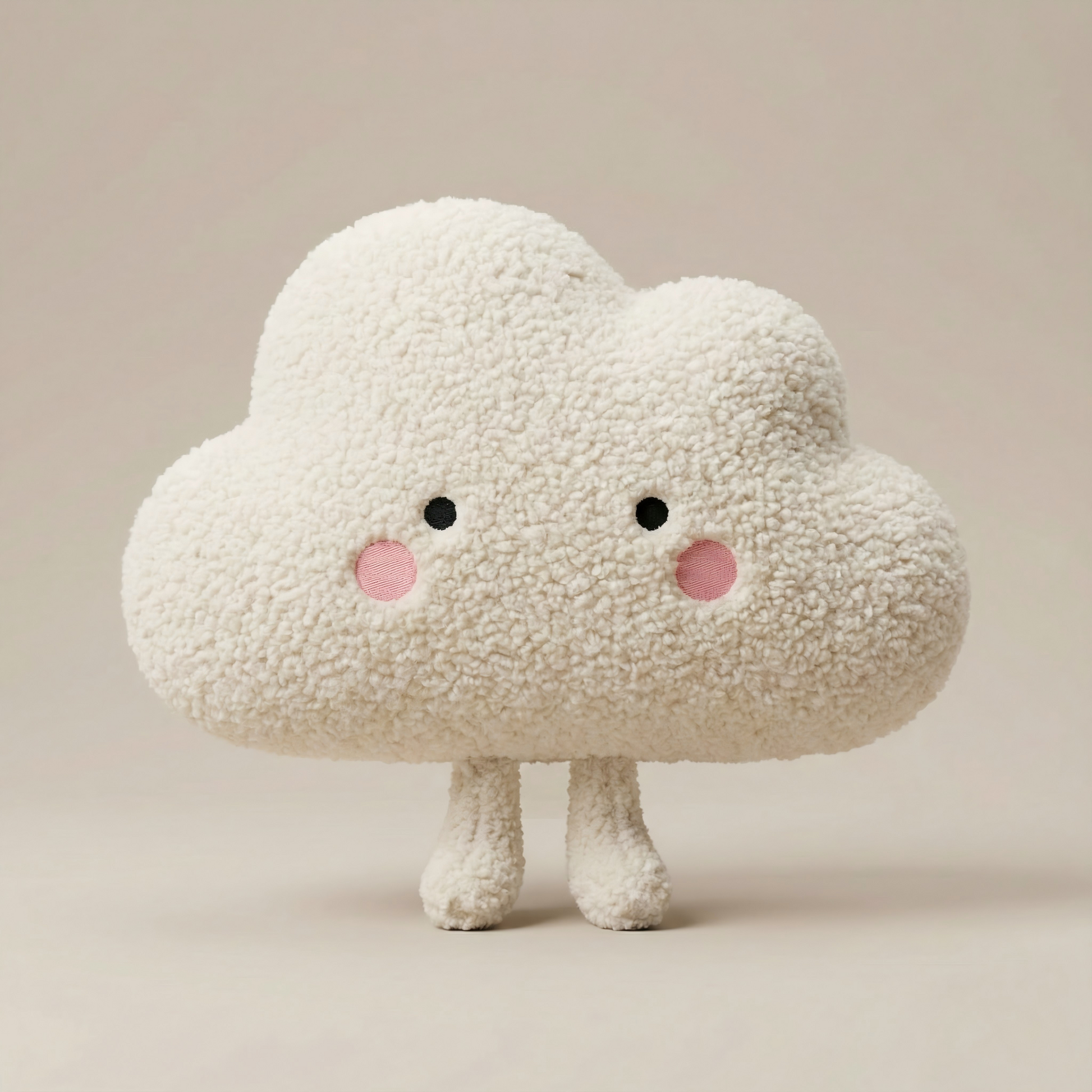 Bring a touch of sky-high cuteness to your home with this adorable Cloud Plush Doll. Covered in a textured, cream-colored sherpa fleece (teddy fabric), this doll is soft to the touch and perfect for cuddling. It features a whimsical design with a sweet, embroidered face, rosy pink cheeks, and playful dangling legs. Whether used as a charming accent in a nursery or a cozy companion on the sofa, it adds warmth and personality to any room.